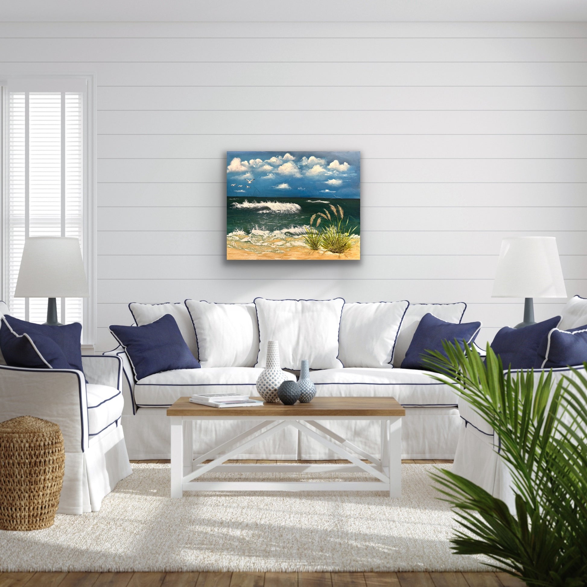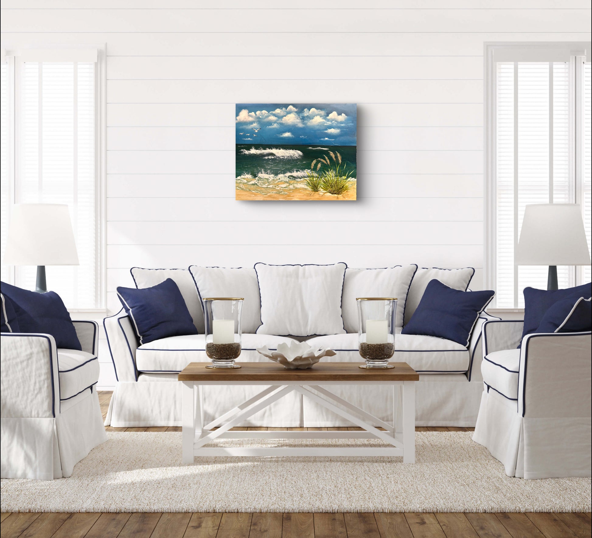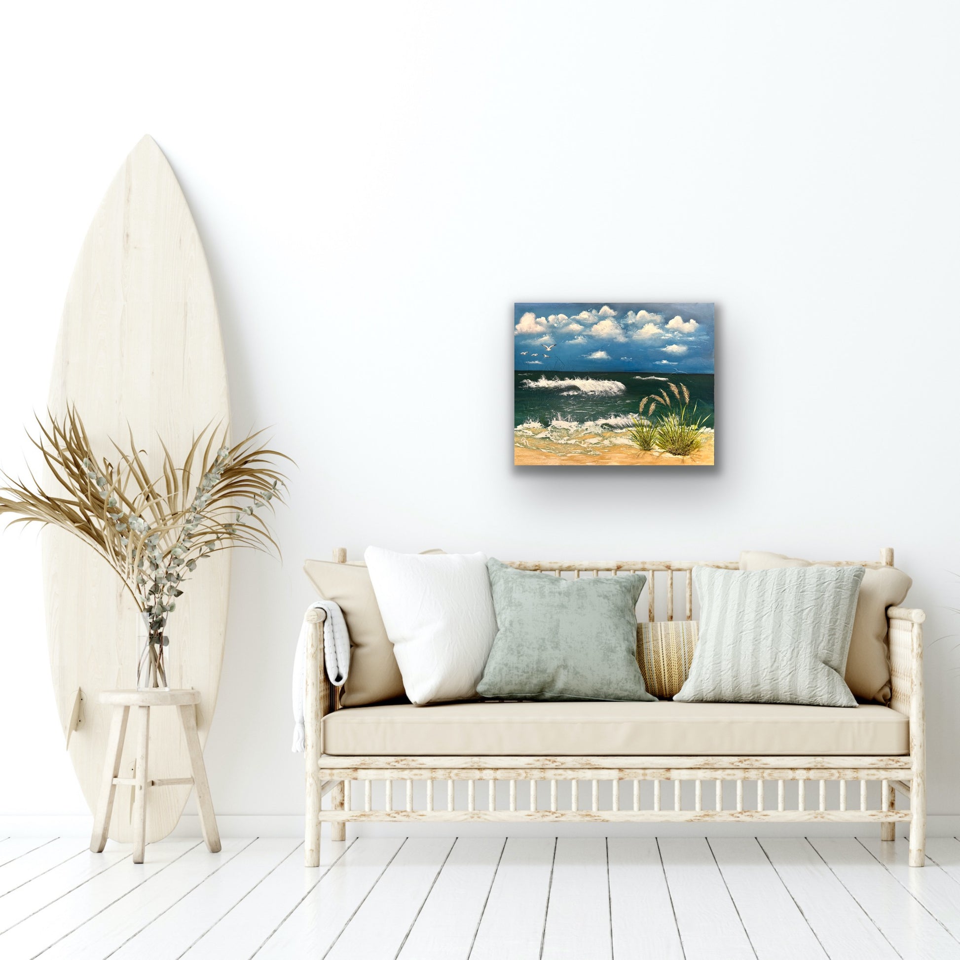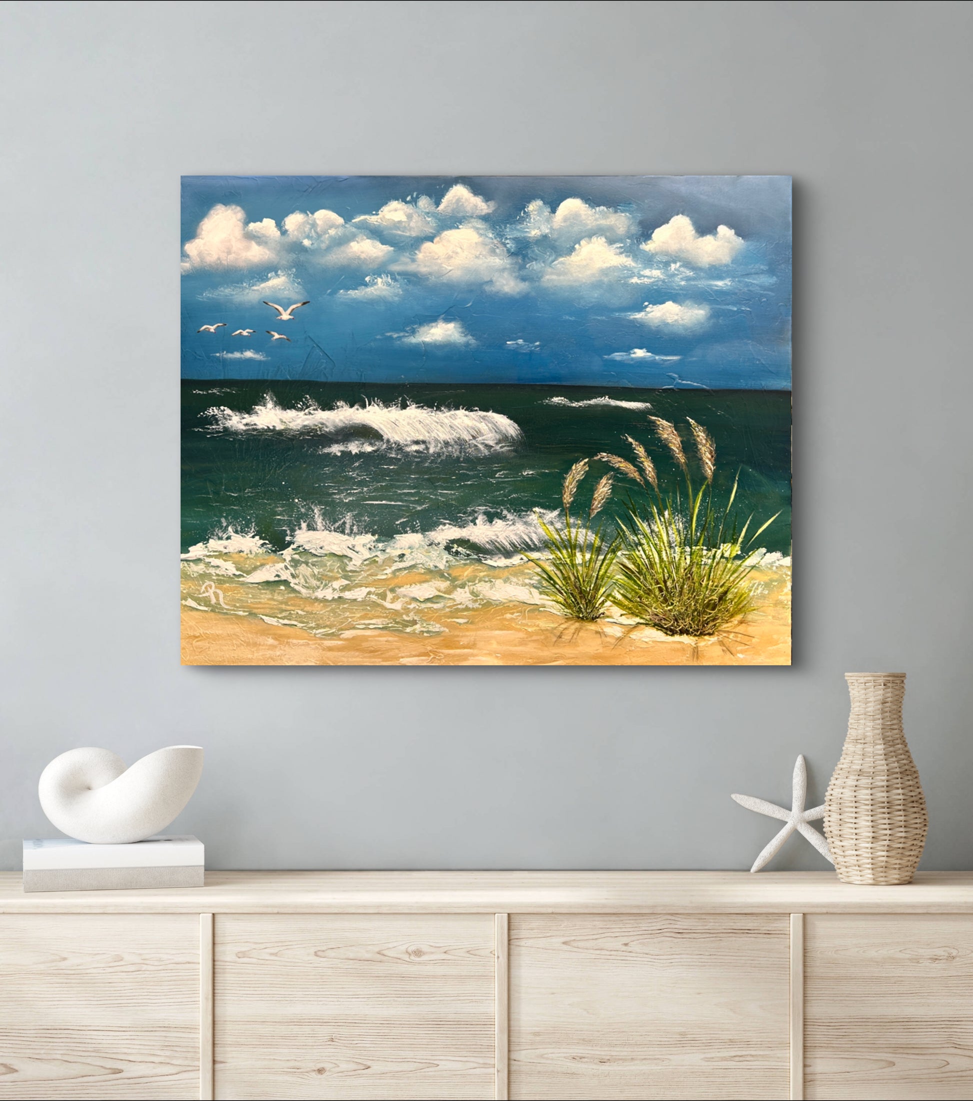 Indulge in the mesmerizing charm of The Emerald Sea Oil Painting. This textured piece depicts a tranquil ocean with a vibrant blue sky and graceful white clouds, accompanied by the soothing sound of crashing waves and the gentle breeze of seagulls. Adorn your space with this luxurious artwork and escape to the serene world of the sea.