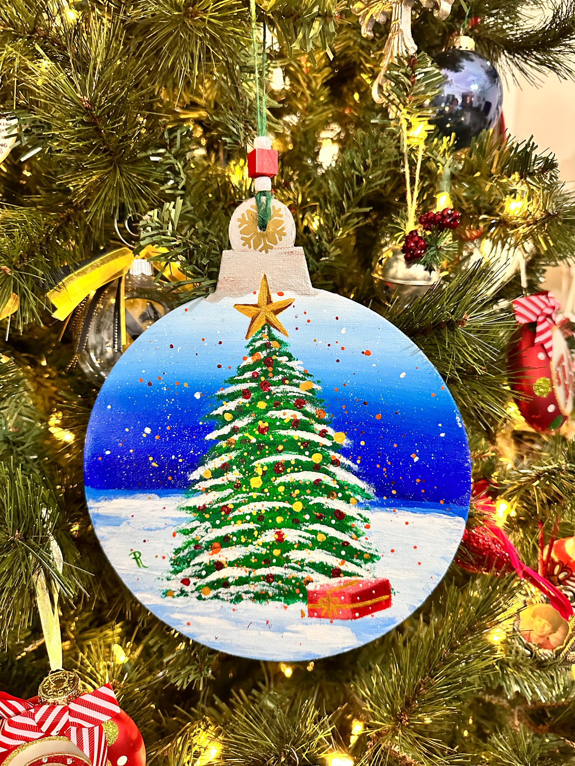 - Acrylic on canvas panel shaped ornament: 8" x 8"