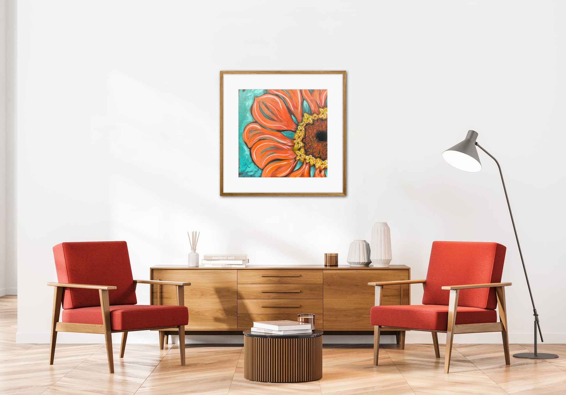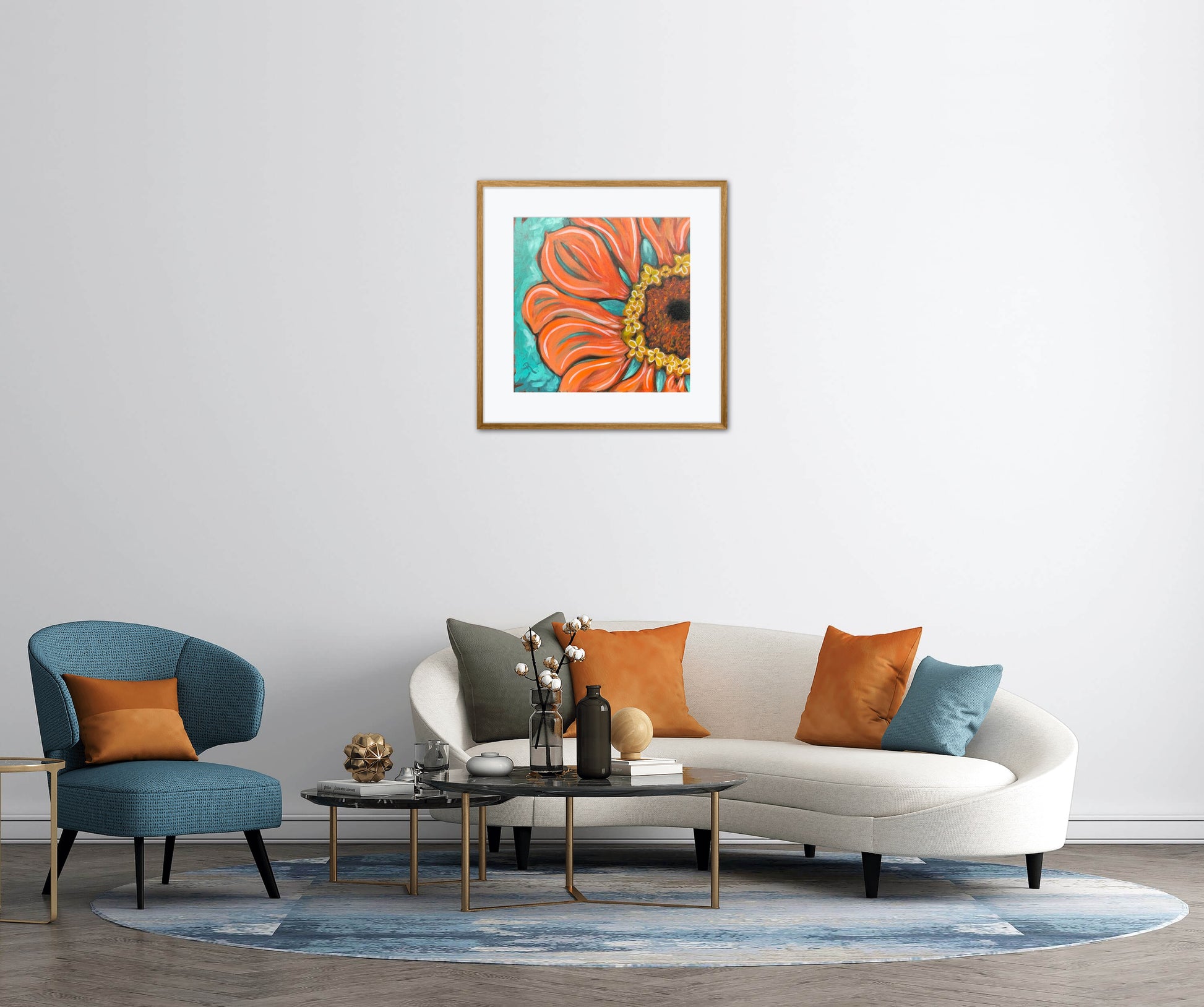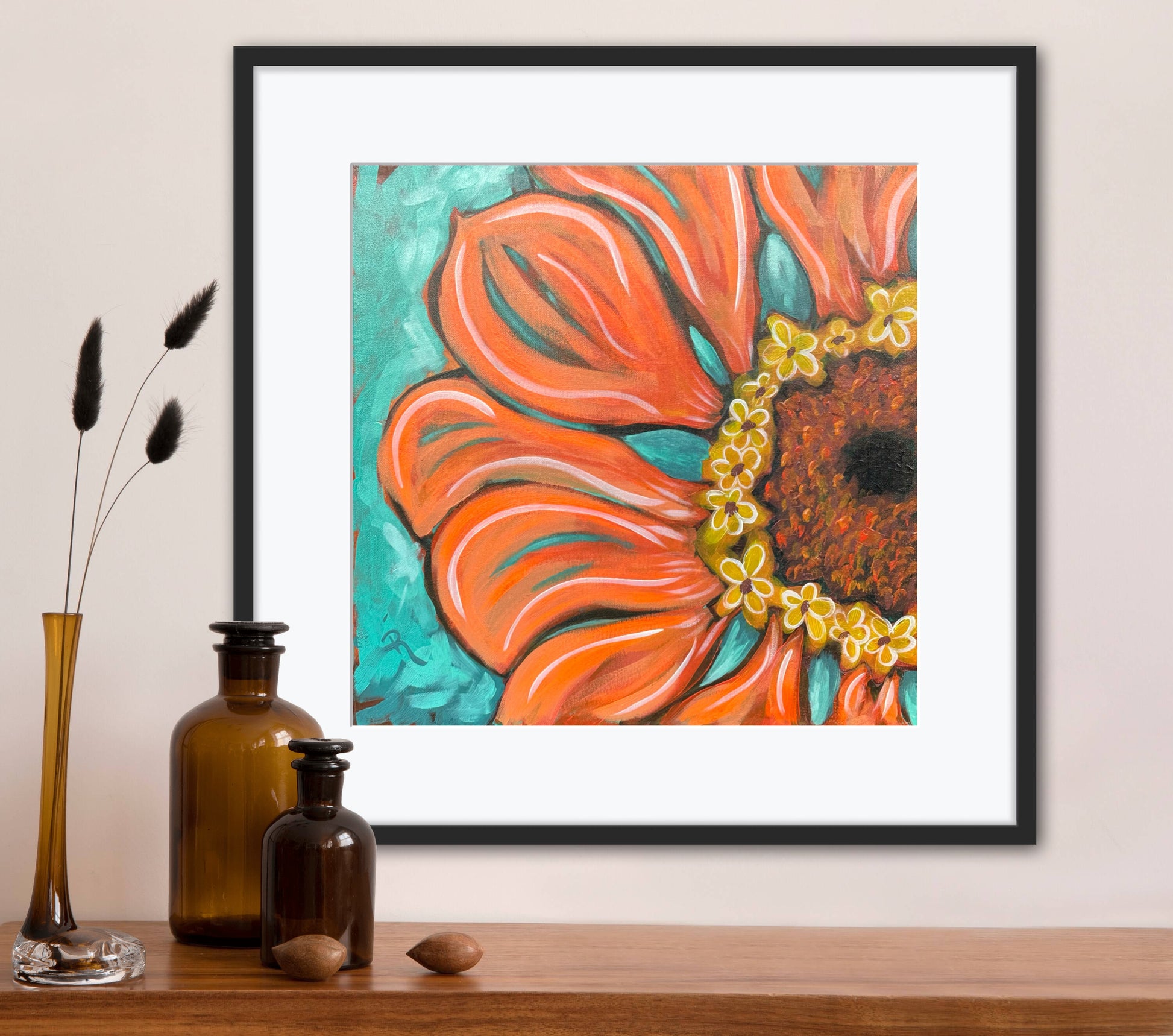 Feel inspired and energized with this dazzling orange zinnia flower acrylic painting. Make a bold statement and enjoy the passionate beauty of this captivating work of art. Create an unforgettable atmosphere with this amazing piece and allow yourself to be transported to a new realm of possibilities. Embellish your home with a unique and inspiring hand painted work of art with colors of aqua, pink and orange.