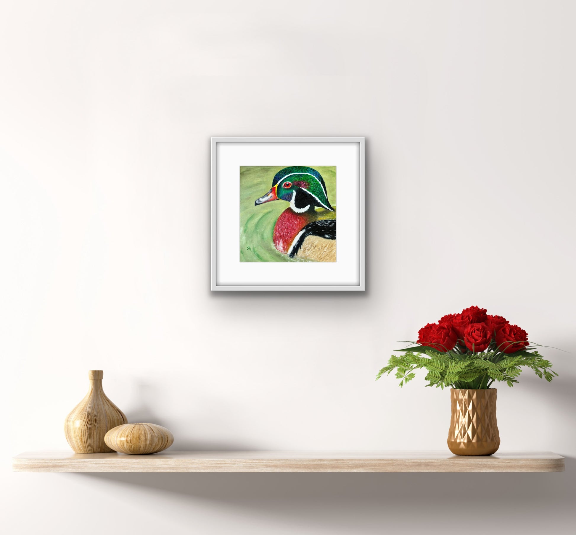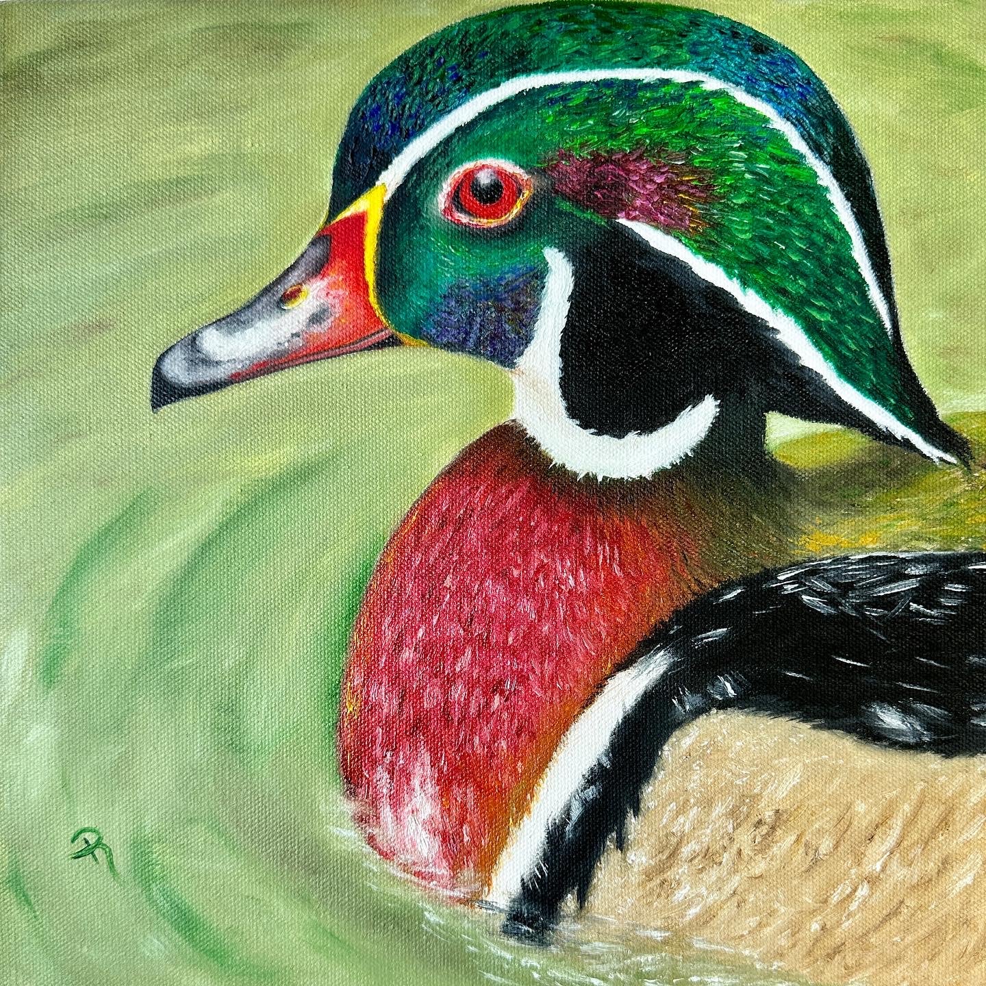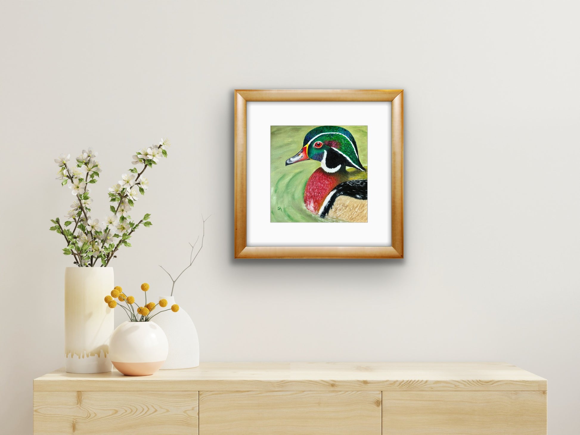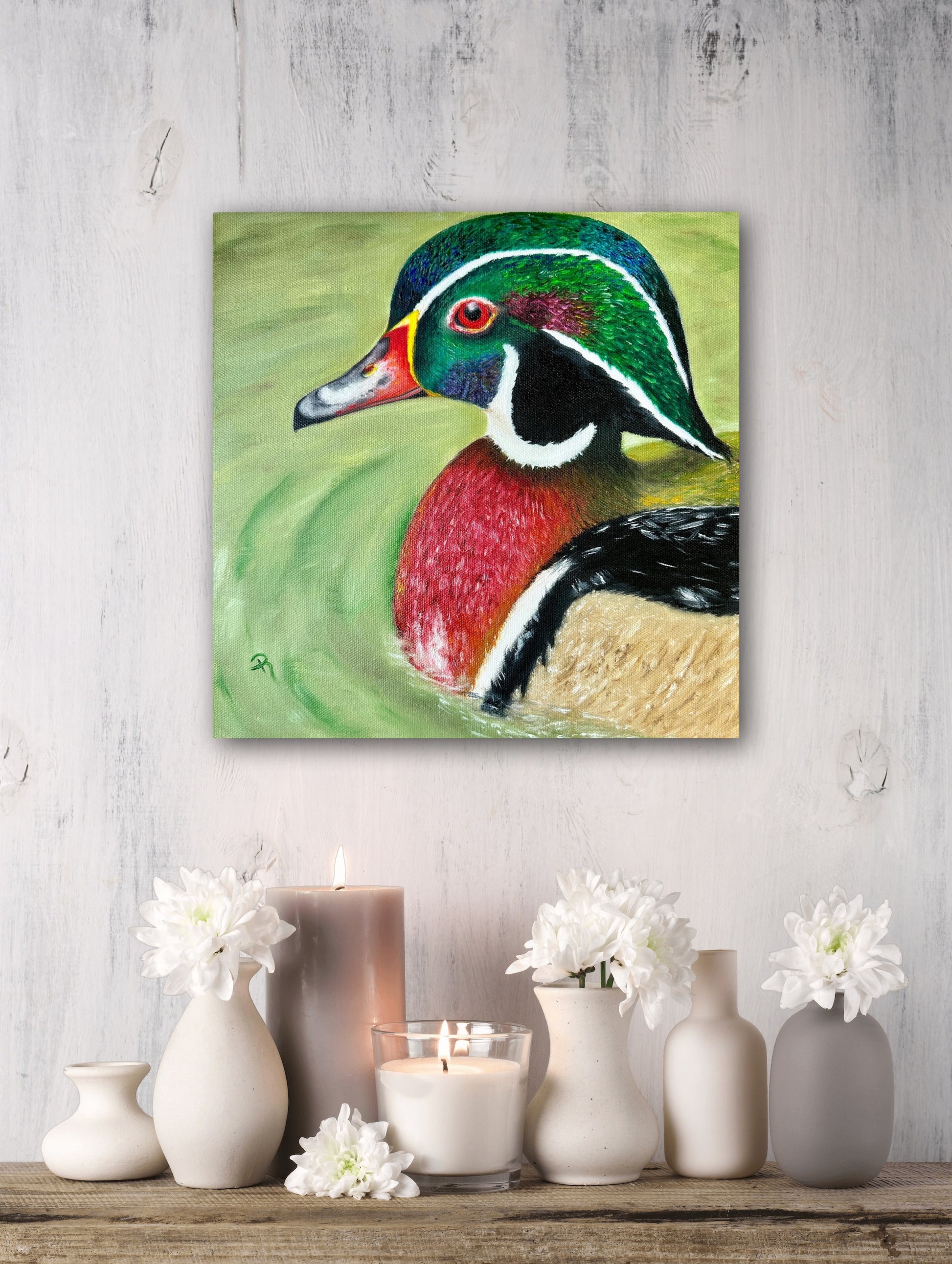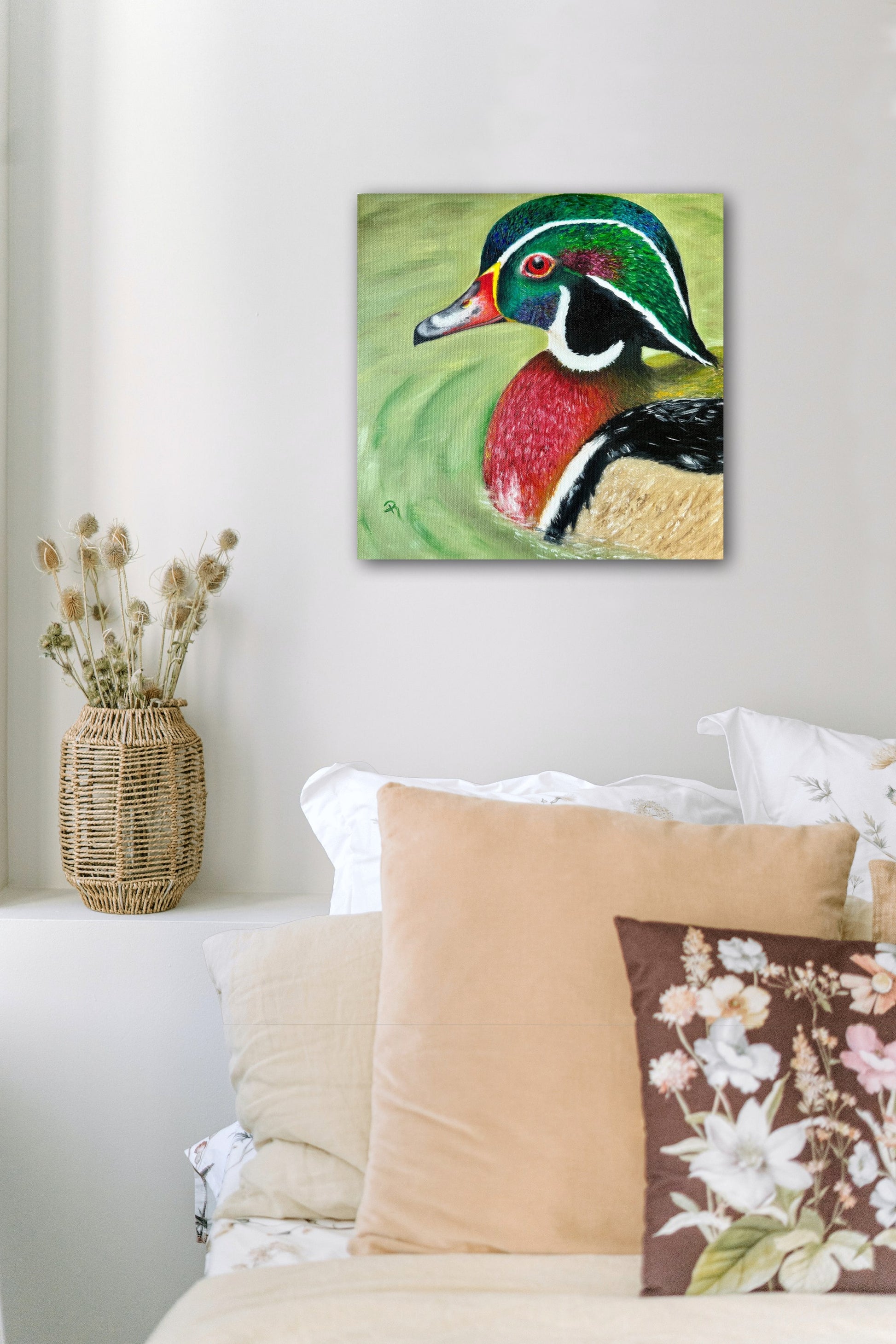 Tranquil Waters: A Wood Duck's Haven is a captivating oil painting of a wood duck in a peaceful pond setting. This timeless piece of artwork will bring a touch of nature to any living space with its mesmerizing beauty and fine details. With its realistic and intricate brush strokes, this painting is sure to be a conversation starter and a lover of ducks or duck hunting.
