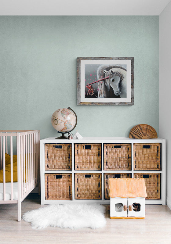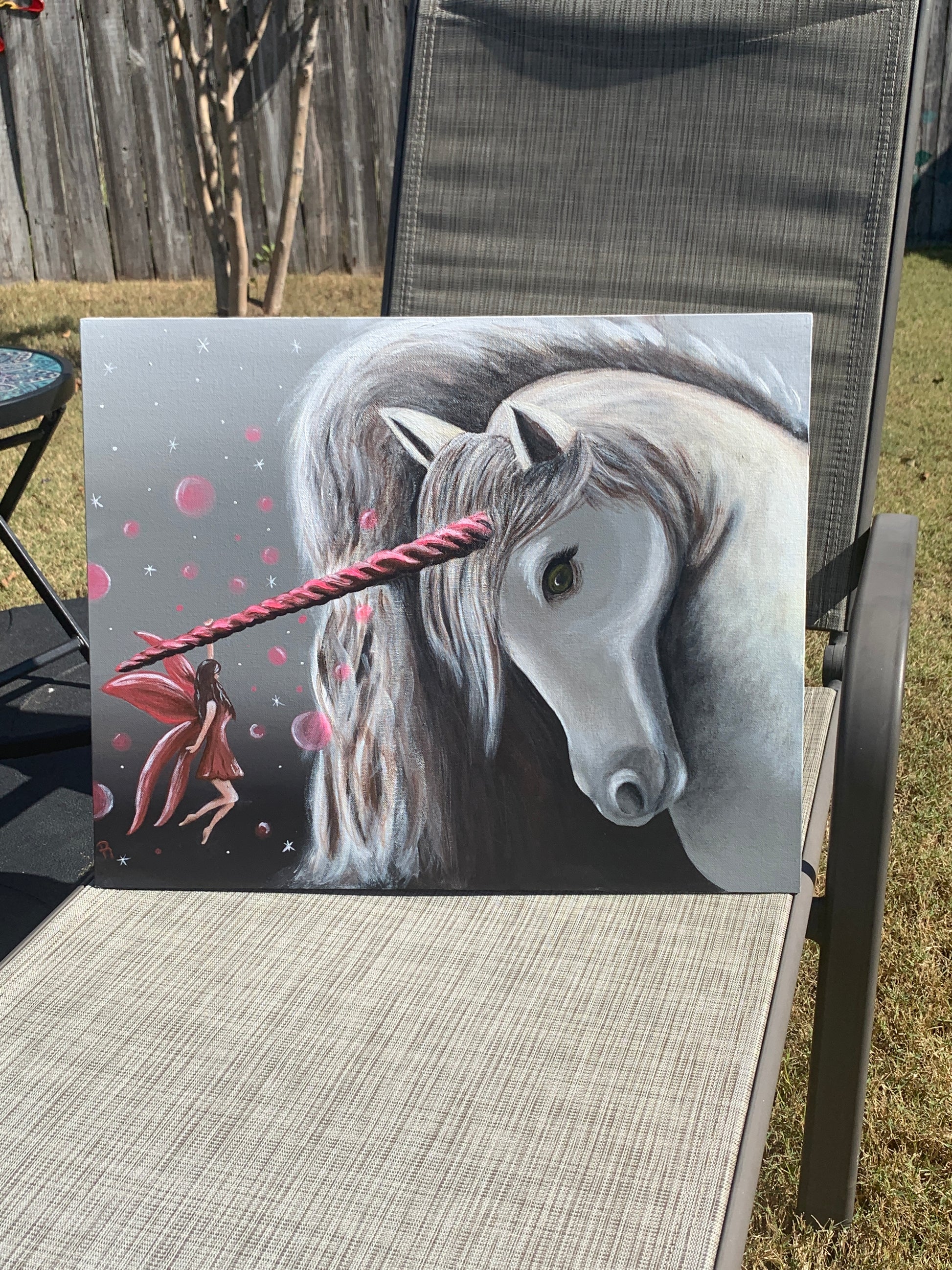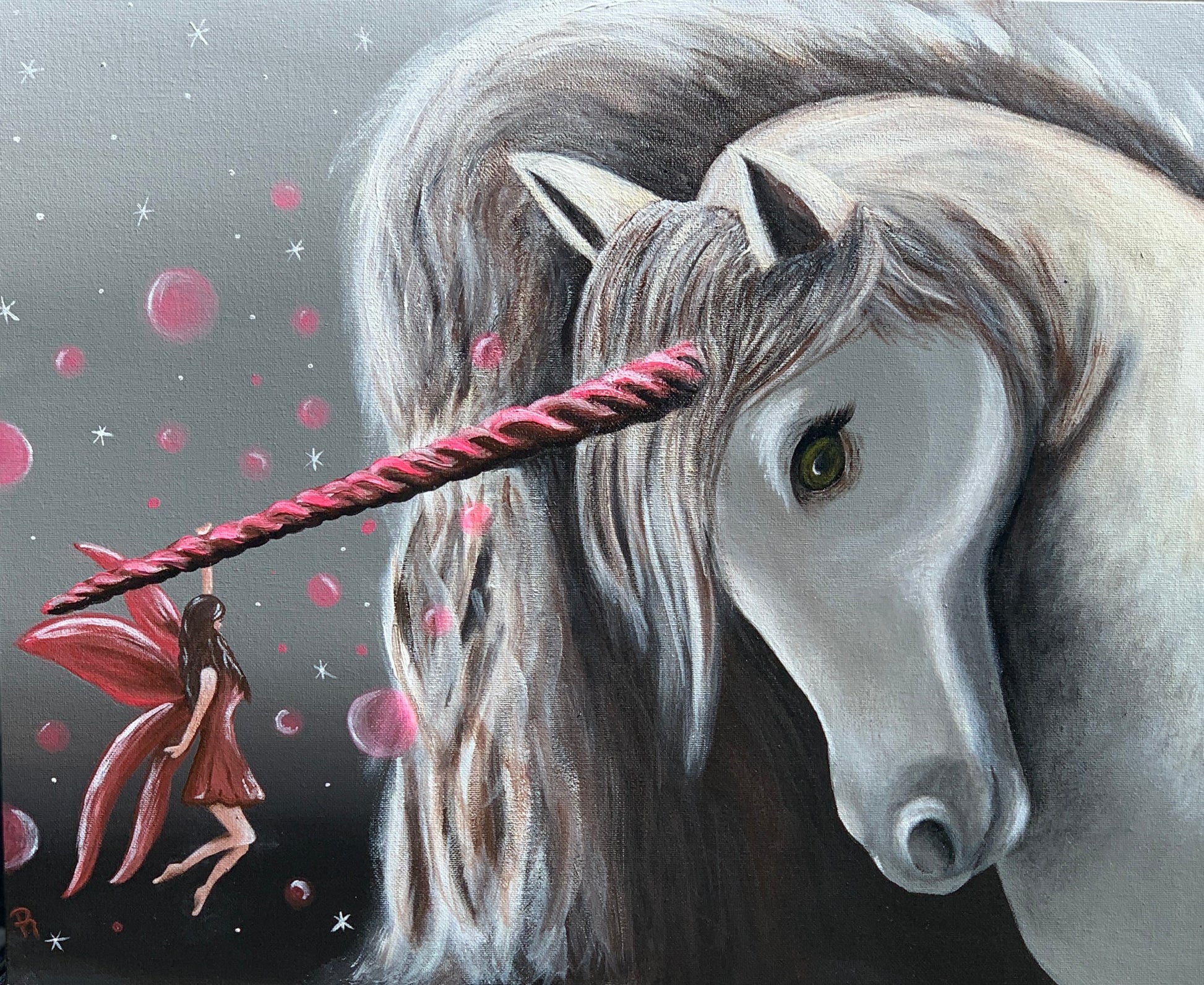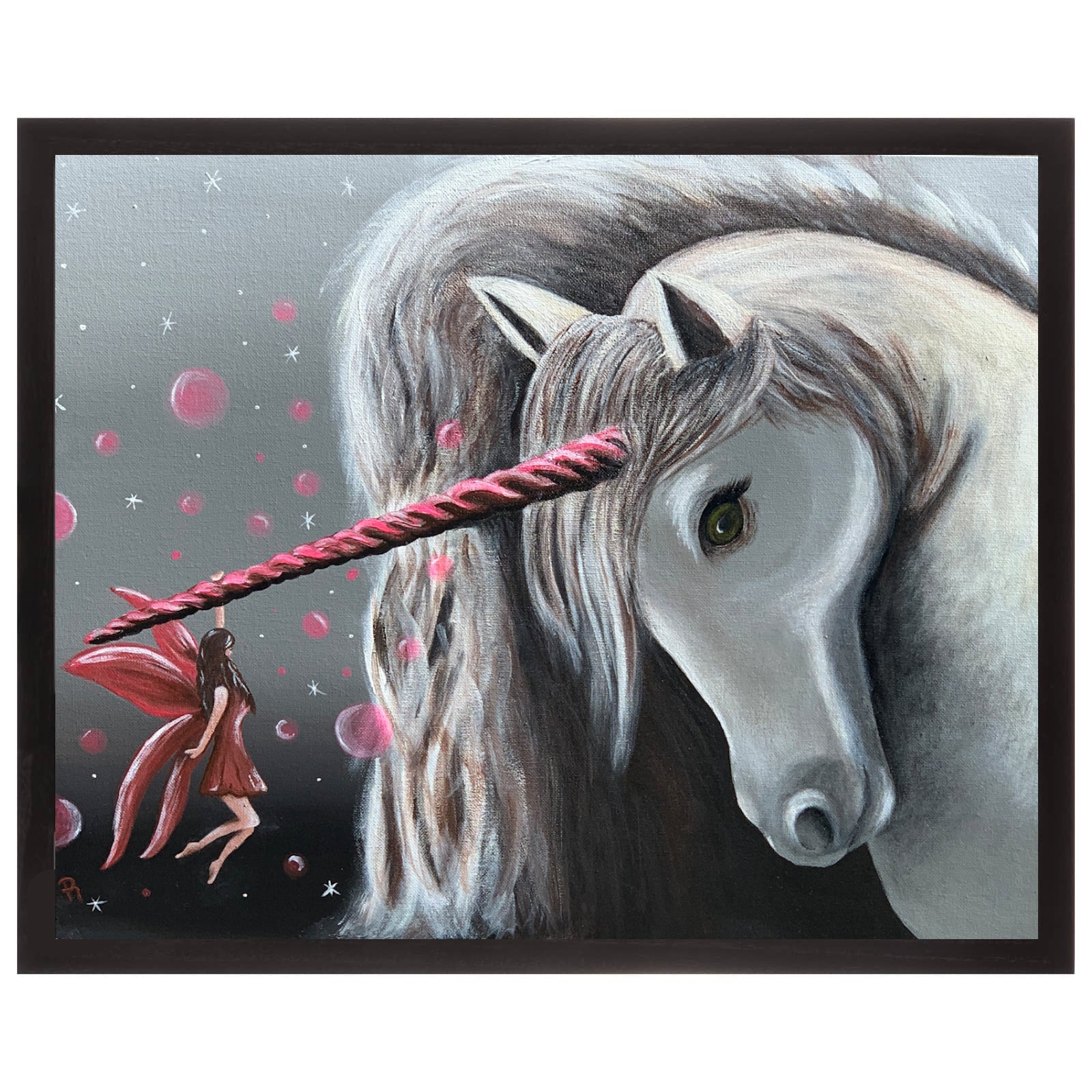 A friend challenged me to paint something she absolutely adores... a unicorn! So, I took the challenge and painted this adorable Unicorn with its Fairy friend. The adorable fairy with flowy wings gently hangs on to the horn of her friend the unicorn. Surround with sparkles of fairy dust and bubbles this whimsical, magical canvas art would look great in the home of someone who loves unicorns or fairies. Created with hues of gray and pink it would make a great gift idea for the unicorn lover and would look adorable in a child's bedroom too.