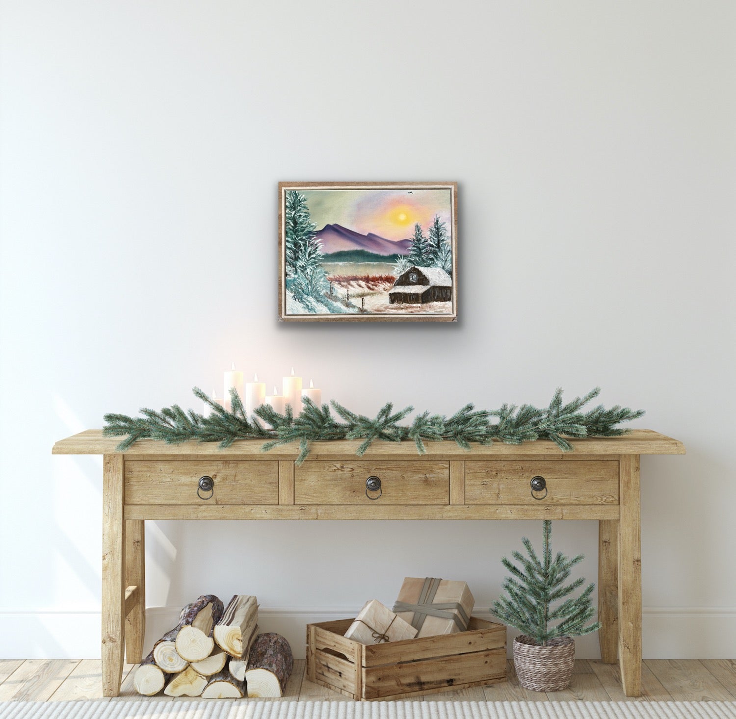 Whispers of Winter captures the serene beauty of a snow-laden landscape, where majestic trees stand sentinel beside a weathered barn nestled against dramatic mountain peaks. This oil painting masterfully renders the interplay of light and shadow across pristine snow, creating depth and atmosphere that draws the viewer into a moment of quiet contemplation. The artist's brushwork conveys both the grandeur of nature and the intimate charm of rural solitude, making this piece a compelling focal point for any collection that appreciates classical landscape artistry.