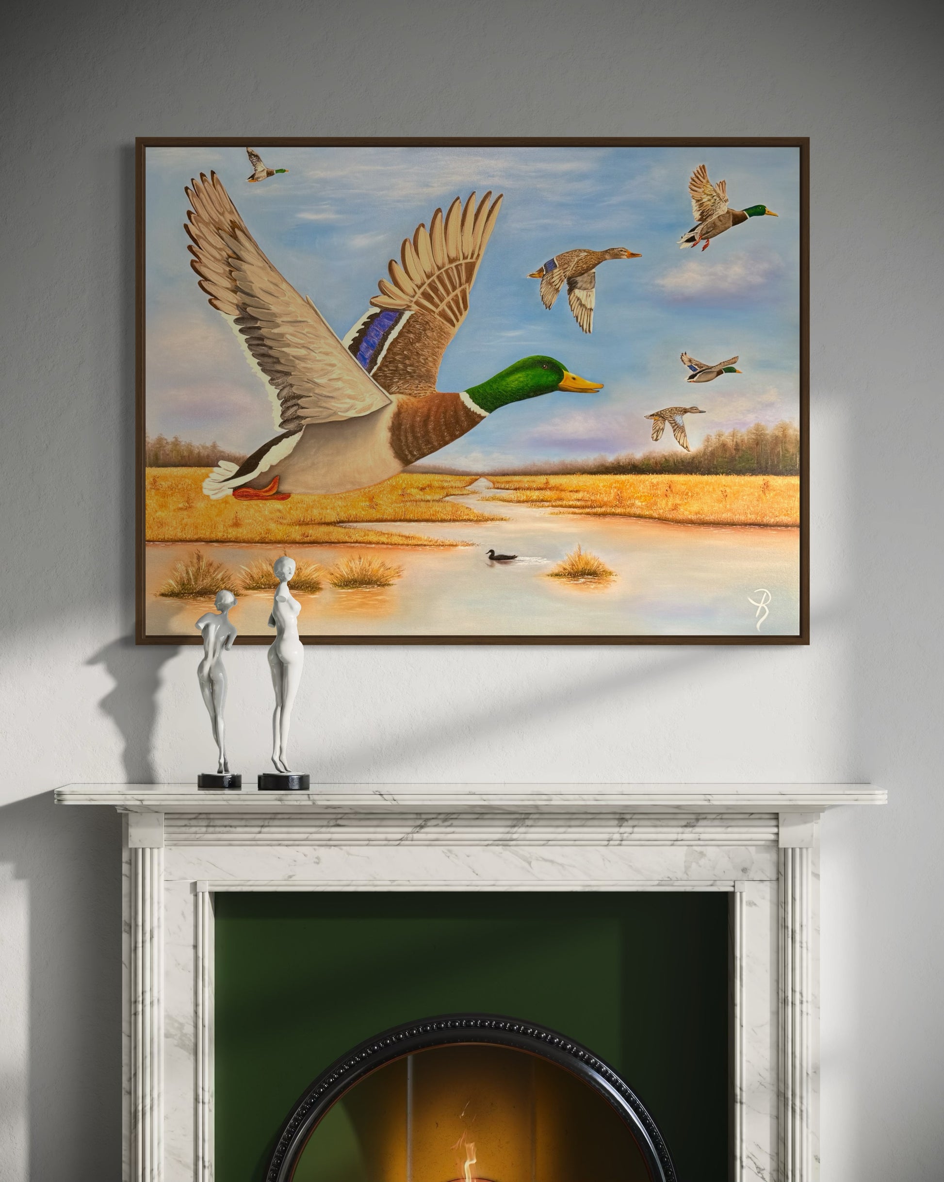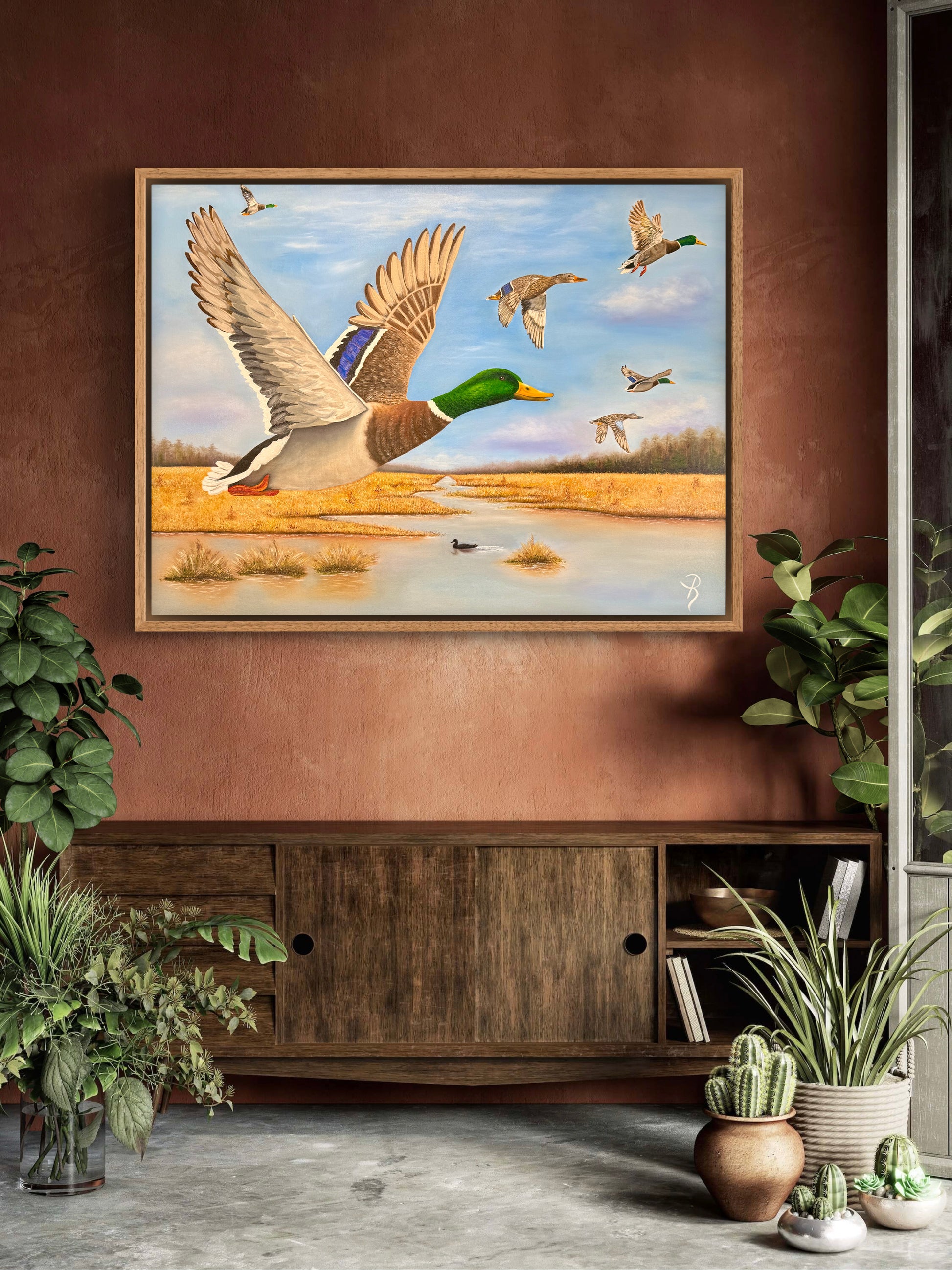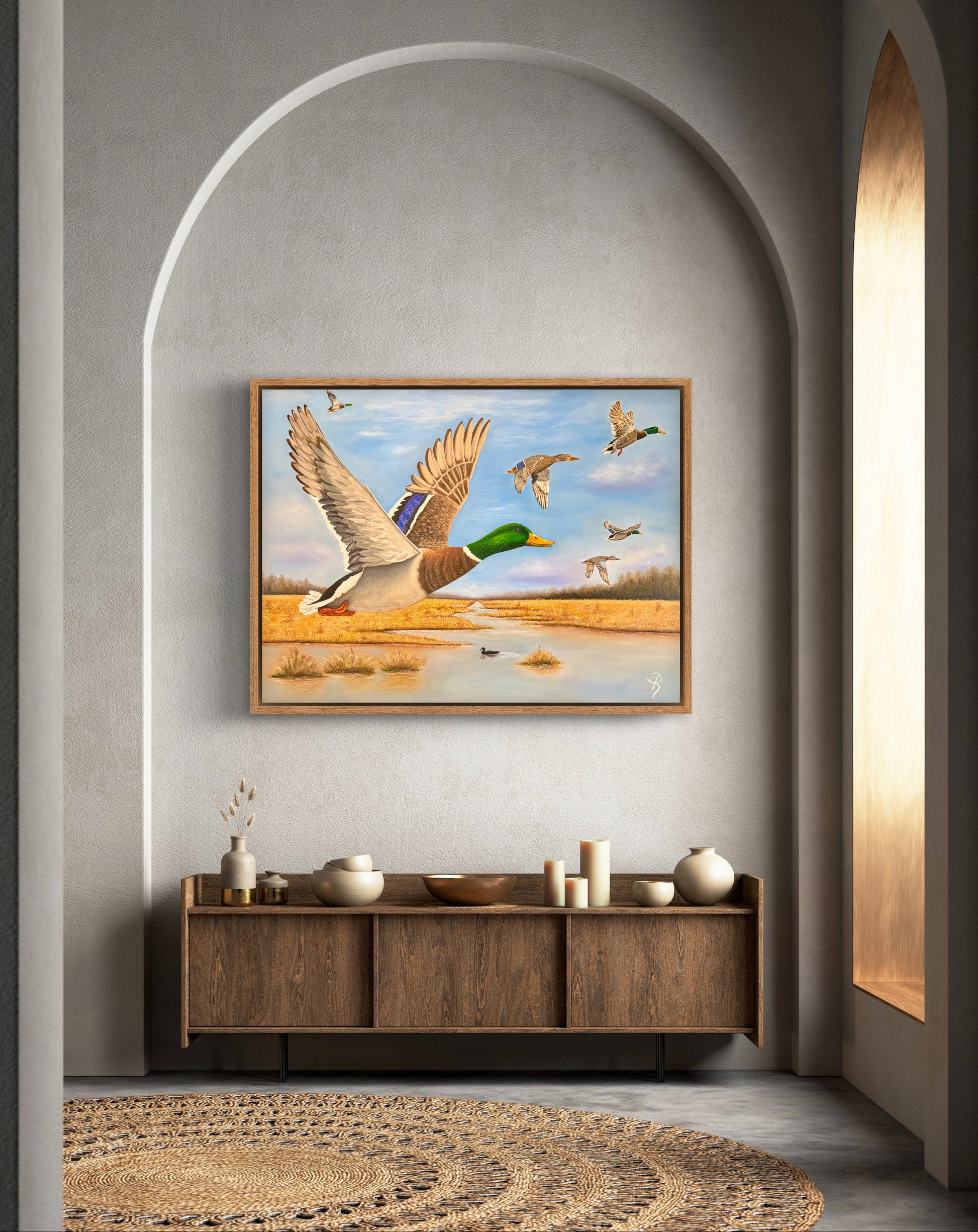 Experience the serene beauty of wetland life with this sophisticated oil painting, capturing mallard drakes, a blue-winged teal hen, and a mallard hen amidst lush grassy marshland. The detailed brushwork and rich colors bring this tranquil landscape to life, making it a refined addition to any art collection or living space.