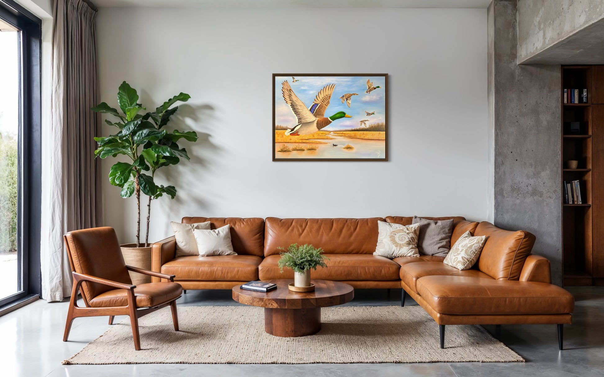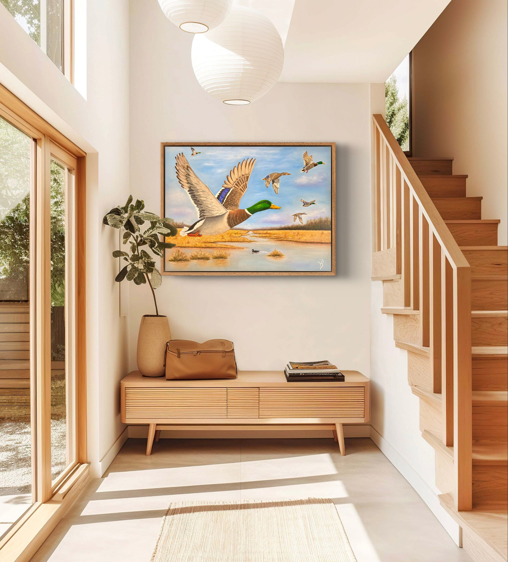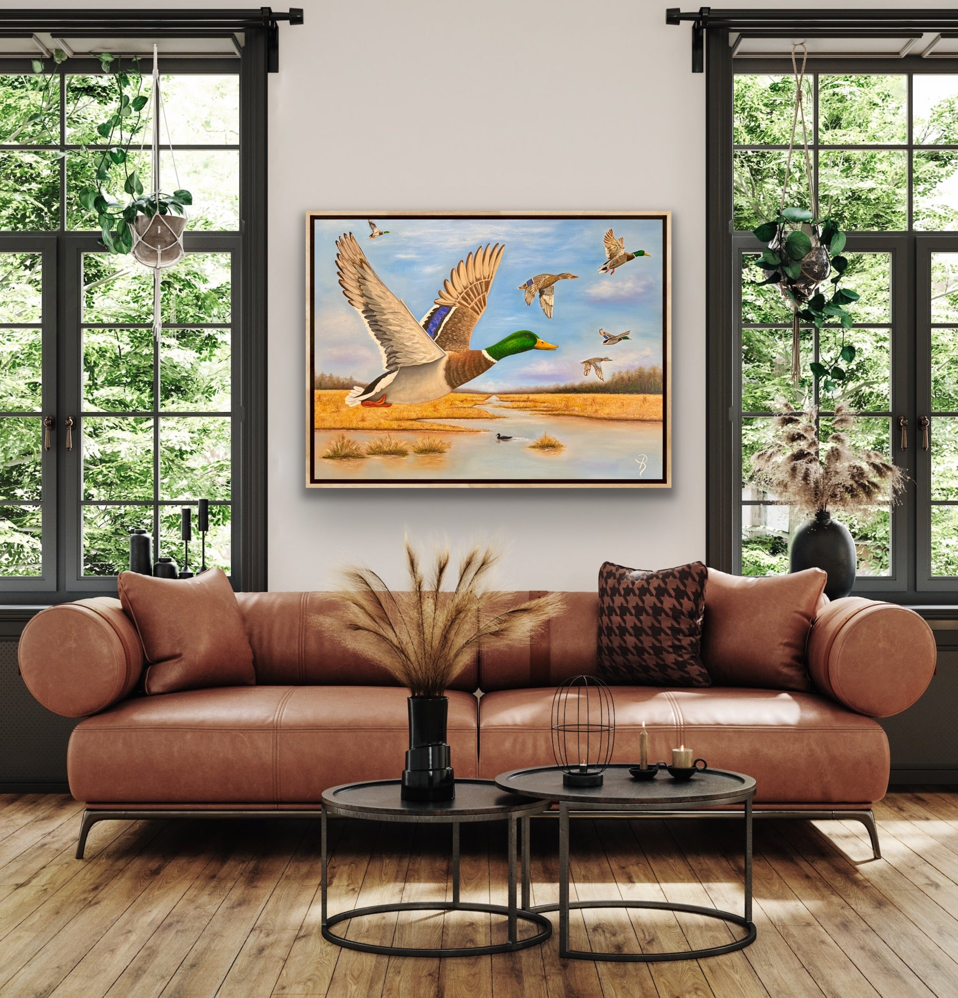 Experience the serene beauty of wetland life with this sophisticated oil painting, capturing mallard drakes, a blue-winged teal hen, and a mallard hen amidst lush grassy marshland. The detailed brushwork and rich colors bring this tranquil landscape to life, making it a refined addition to any art collection or living space.