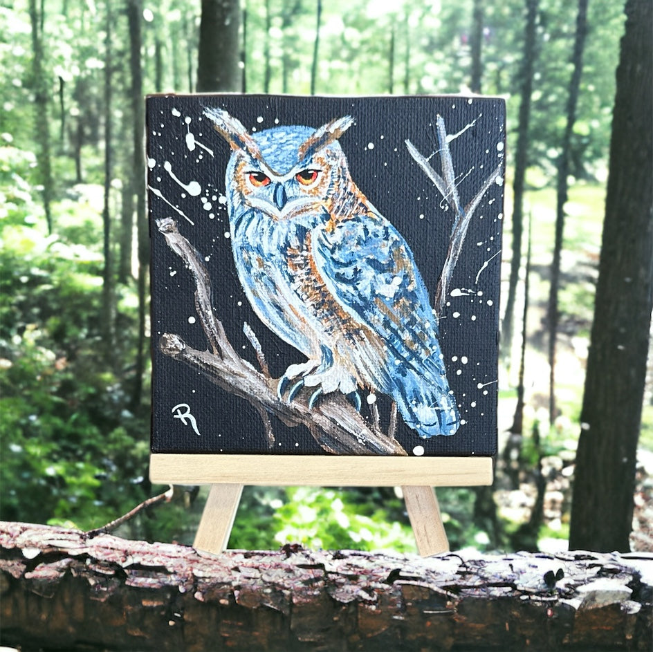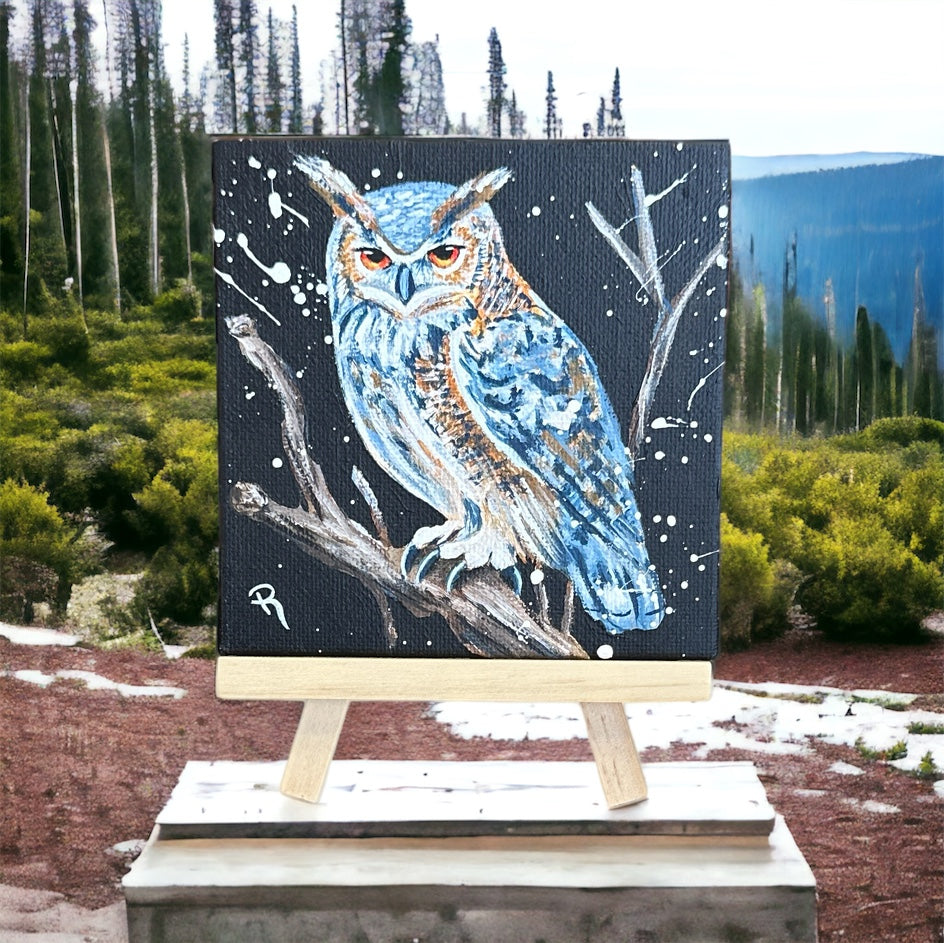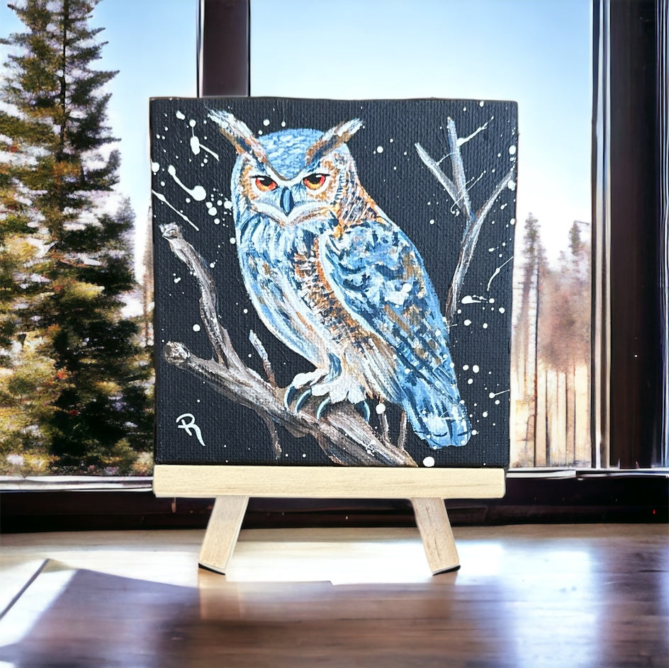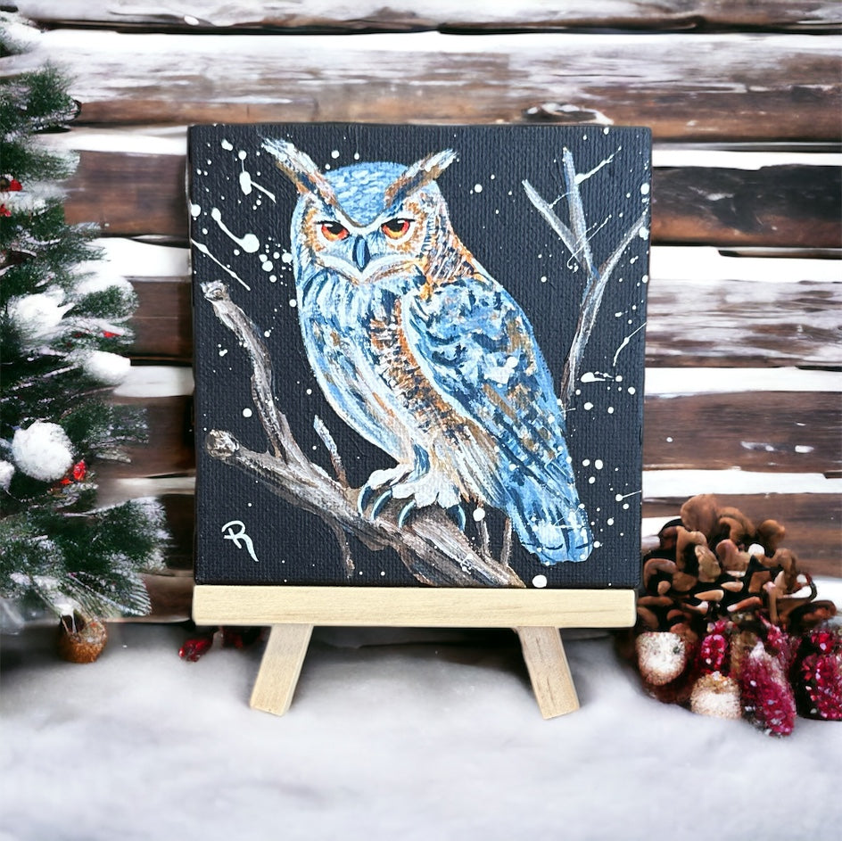 Bring some winter magic to your home with this adorable 4"x 4" acrylic painting of a majestic winter owl perched on a tree branch. With its vibrant blue hues and included easel, this piece of art is sure to be the talk of the roost!