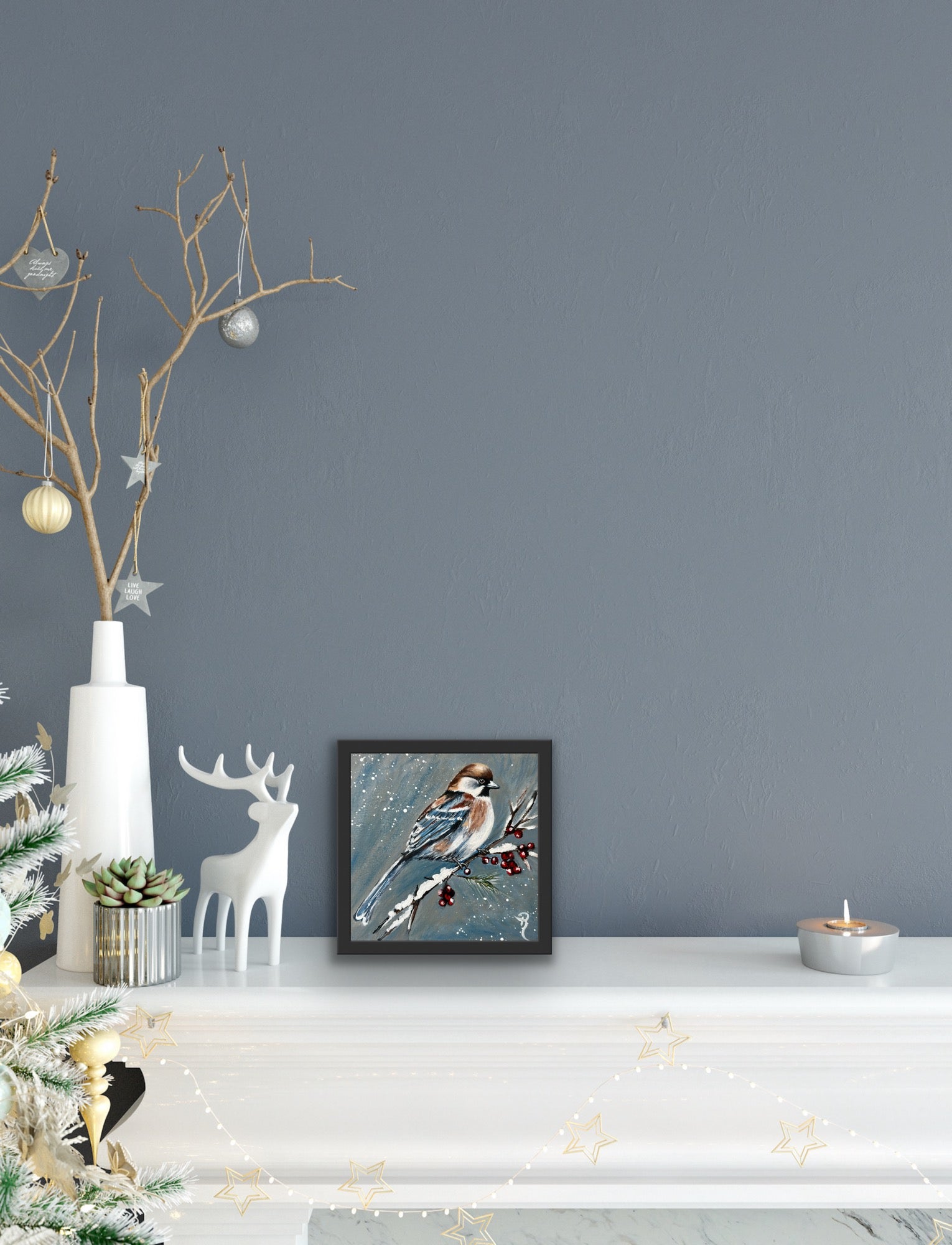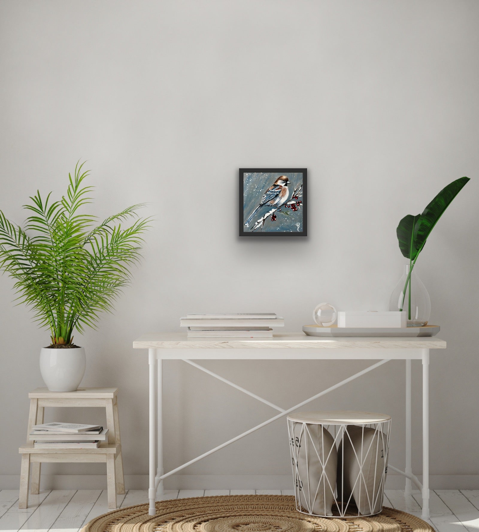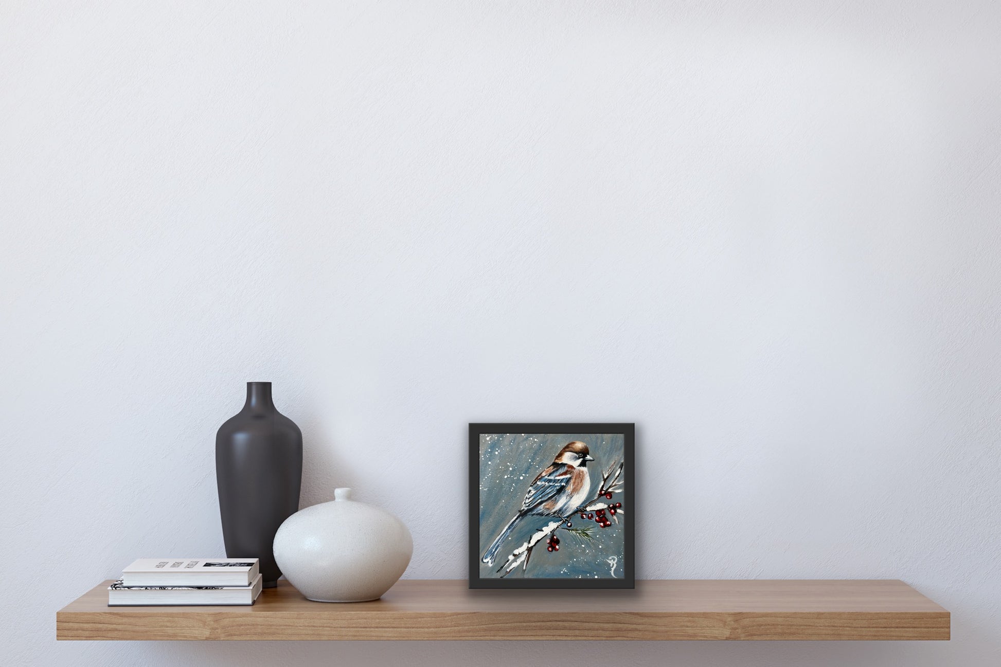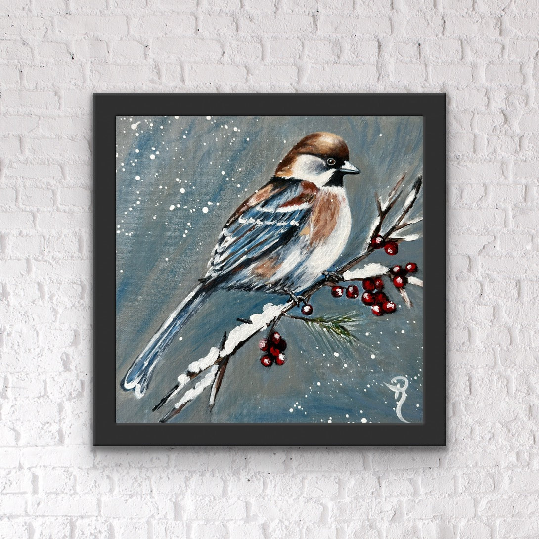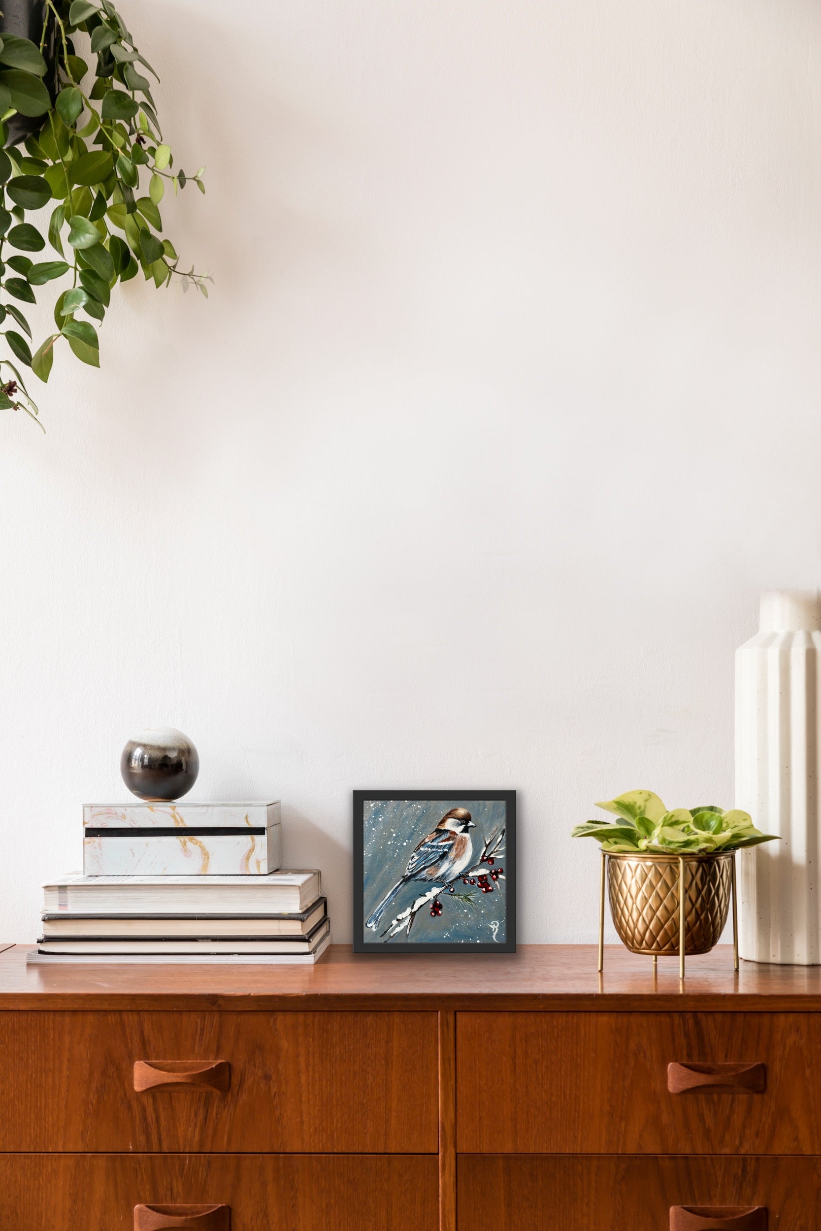 This small painting captures the delicate charm of a winter sparrow perched on a snow-covered branch. Soft snow drifts cling to the branch and dust the vibrant red berries, creating a serene winter scene. The sparrow’s detailed feathers are painted in warm, earthy tones, contrasting beautifully with the cool blue-gray background. Subtle white paint splatters suggest falling snow, adding a touch of movement and magic to this tranquil setting. Perfect for those who appreciate the quiet beauty of nature in winter.