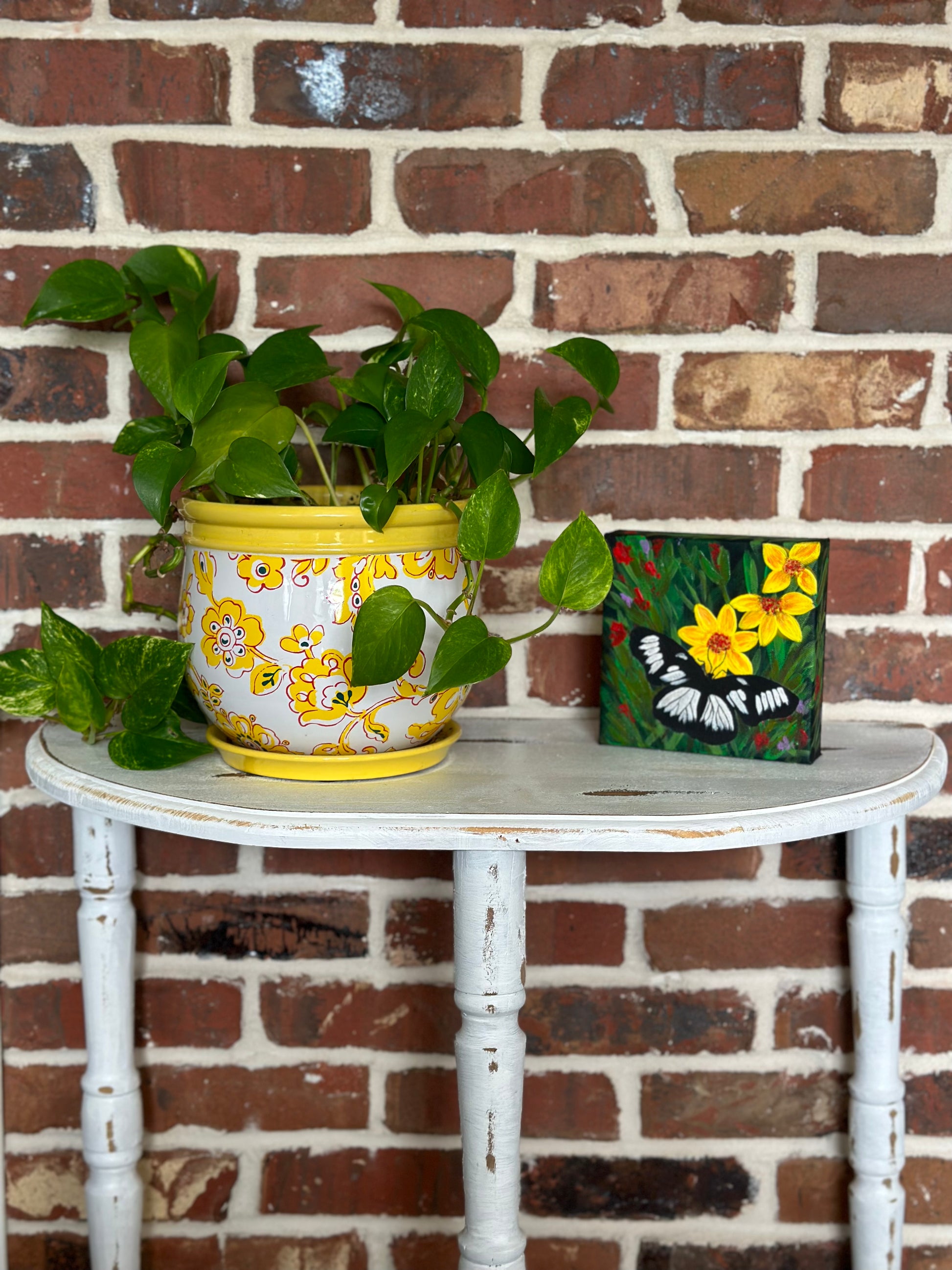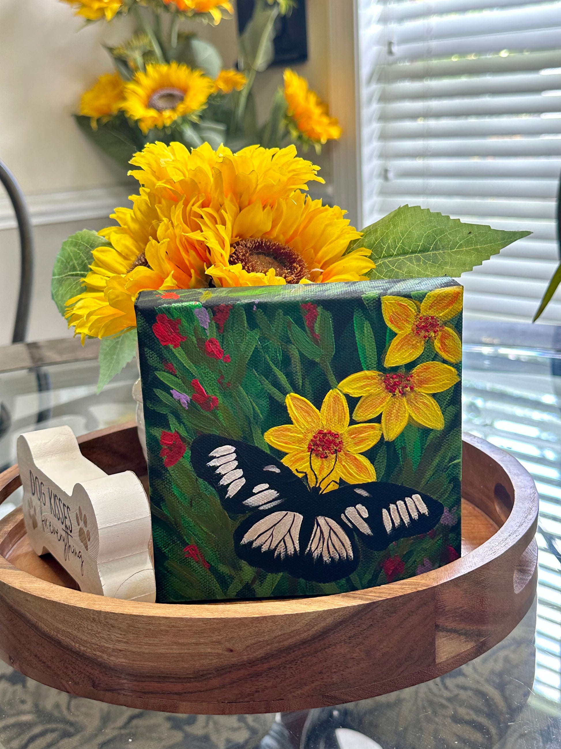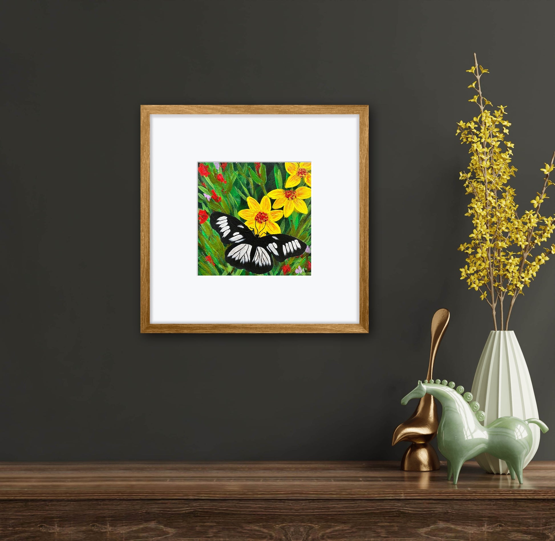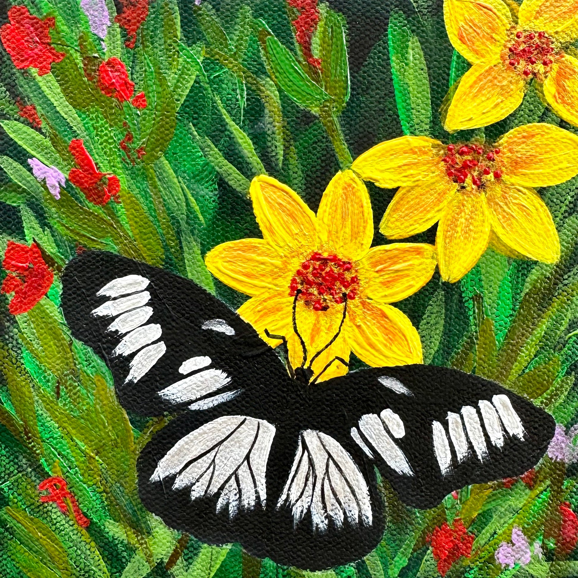 This beautiful Zebra Wings Acrylic Painting will bring an elegant charm to any room. Admire the striking contrast of the yellow flowers and black and white butterfly against the lush green background. Perfect for adding a touch of nature to your space!